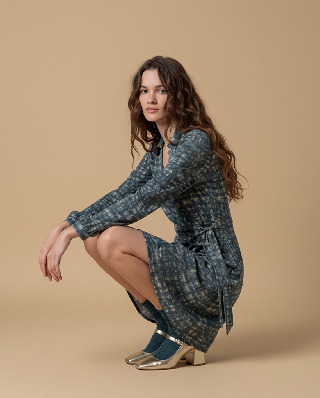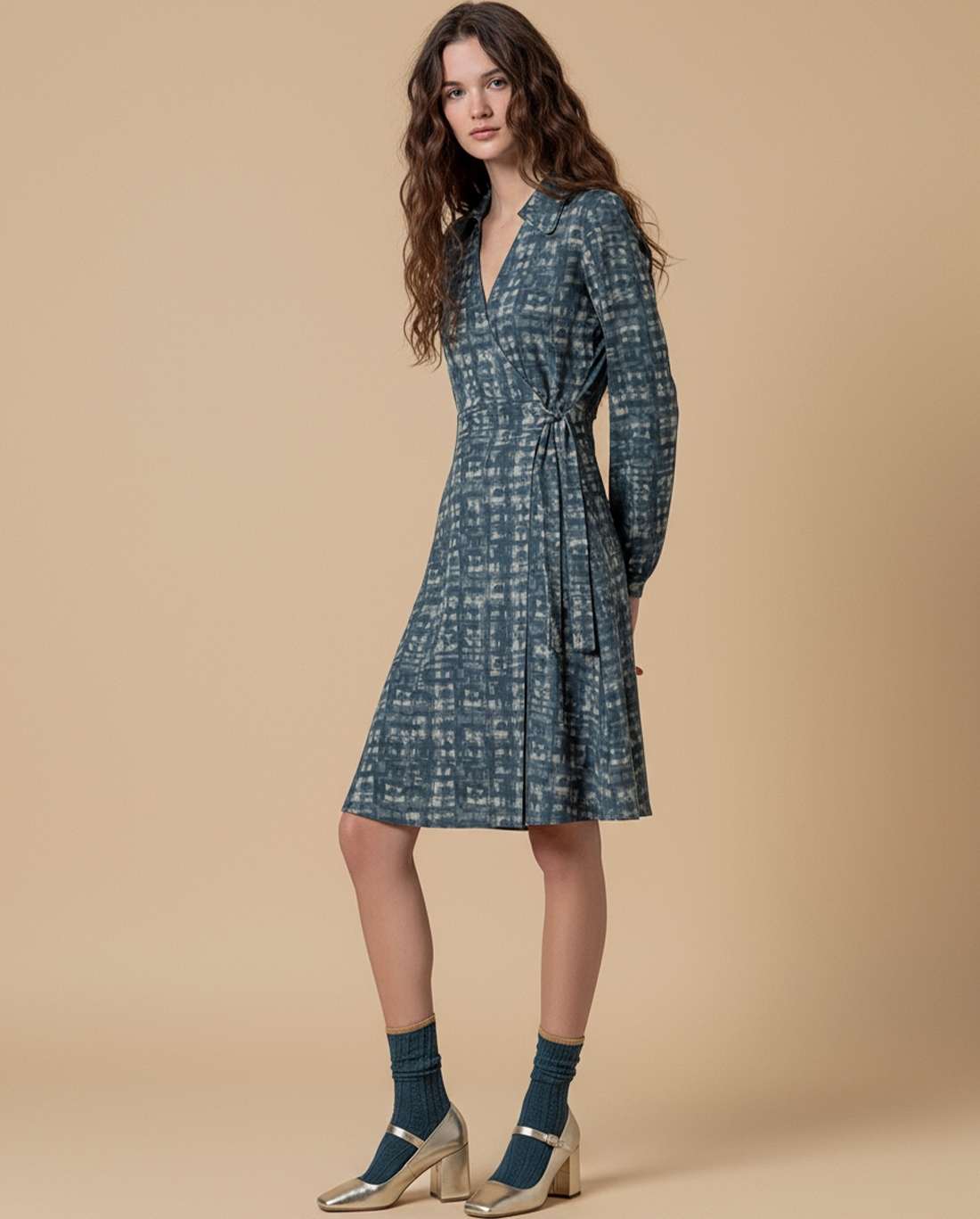Recycled viscose crossover dress combines the comfort of stretch fabric with a flattering design thanks to the knot at the waist. The graphic print and the V-neckline give a modern and fluid look. A very versatile option for any occasion.